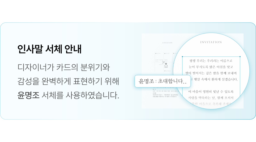 - 초안에서 확정한 오탈자, 정보 오류(청첩장 문구, 약도지명, 교통편 등)는 재인쇄·반품·환불이 불가능해요.