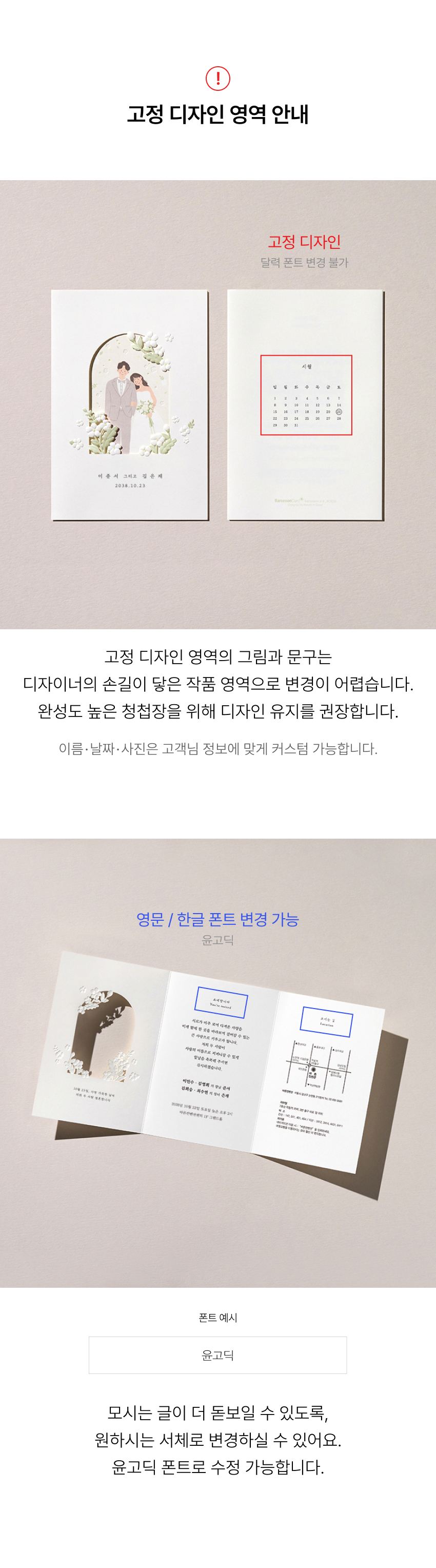 - 초안에서 확정한 오탈자, 정보 오류(청첩장 문구, 약도지명, 교통편 등)는 재인쇄·반품·환불이 불가능해요.