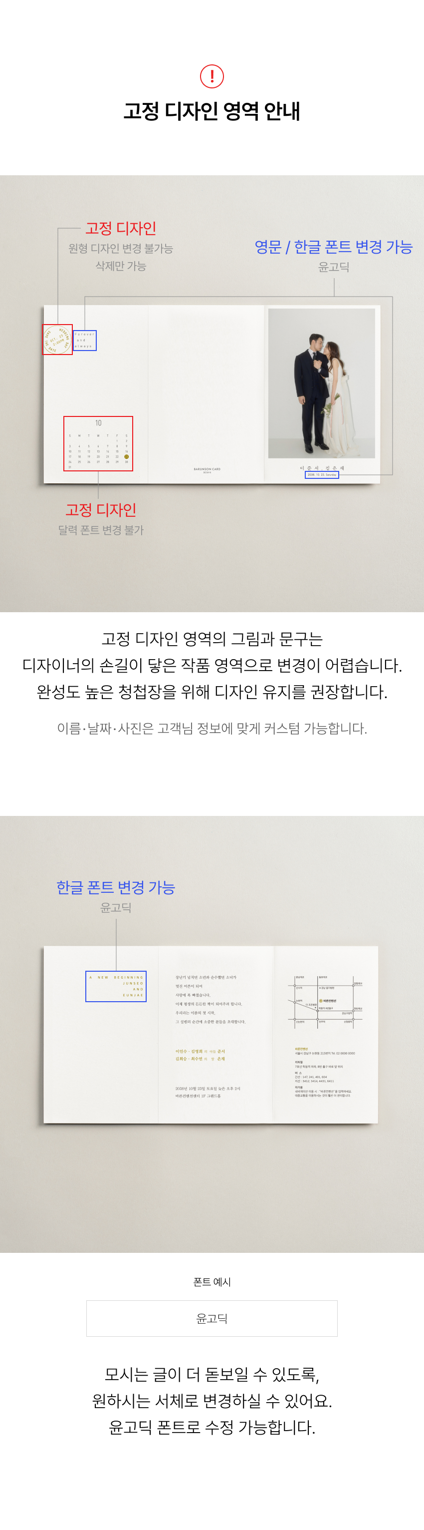 - 초안에서 확정한 오탈자, 정보 오류(청첩장 문구, 약도지명, 교통편 등)는 재인쇄·반품·환불이 불가능해요.