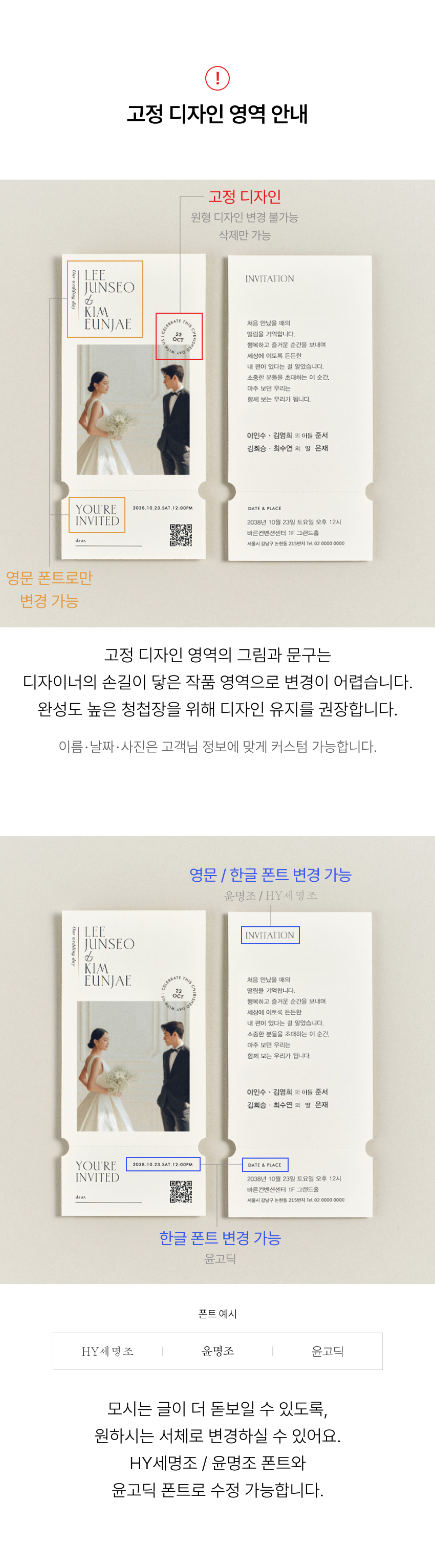 - 초안에서 확정한 오탈자, 정보 오류(청첩장 문구, 약도지명, 교통편 등)는 재인쇄·반품·환불이 불가능해요.