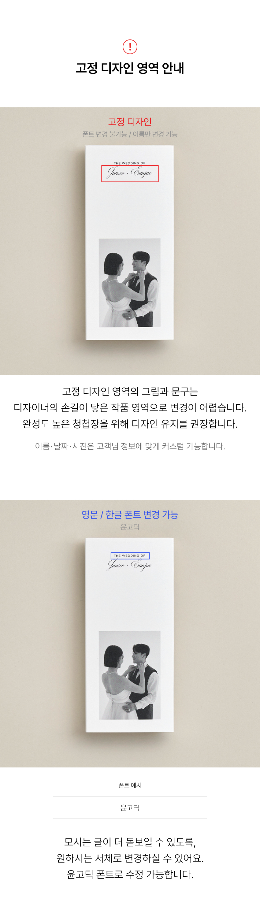 - 초안에서 확정한 오탈자, 정보 오류(청첩장 문구, 약도지명, 교통편 등)는 재인쇄·반품·환불이 불가능해요.