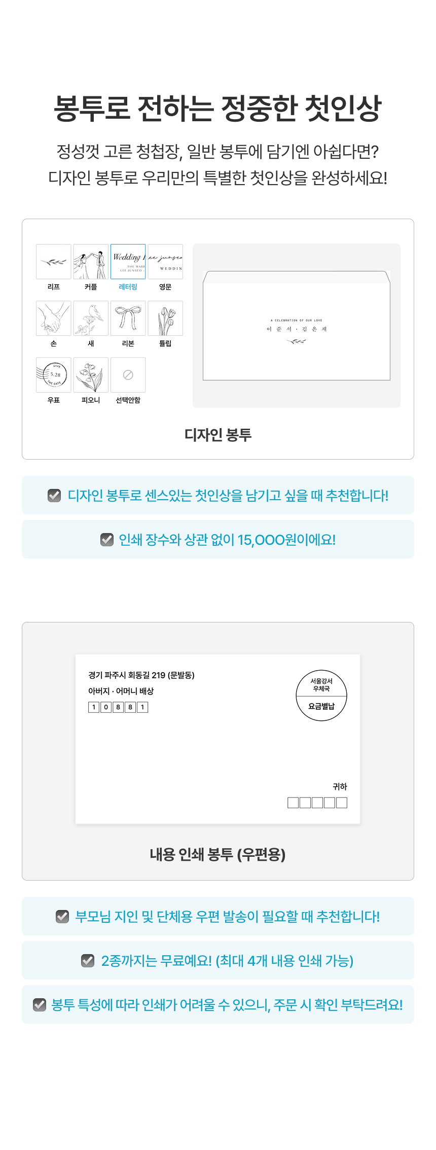 - 초안에서 확정한 오탈자, 정보 오류(청첩장 문구, 약도지명, 교통편 등)는 재인쇄·반품·환불이 불가능해요.